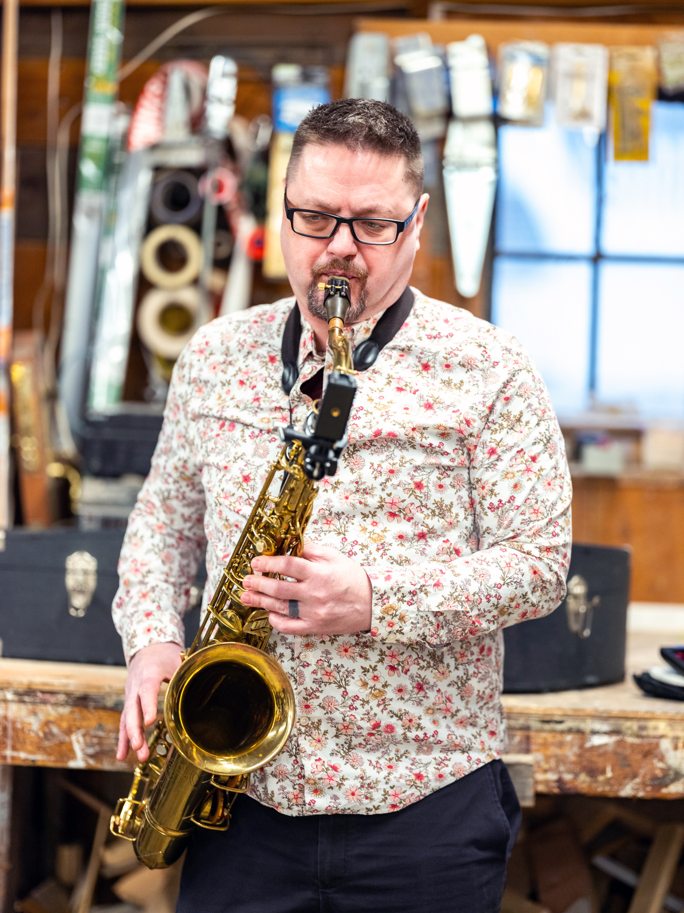 Mayer takes the lead through the first few songs, conducting while playing the saxophone. One finger in the air cues one section of the band to drop in; two signals to the second half when it is their turn; and with a whoop, a twirl of his finger overhead, and a crescendo of horns, the whole band comes back together.