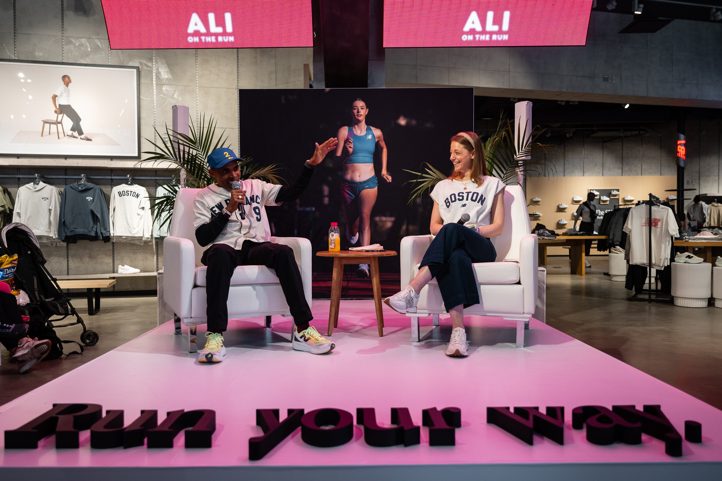 Ali Feller and Olympic silver medalist, Boston Marathon champion and NYC Marathon champion Meb Keflezighi at an “Ali on the Run Show LIVE” event during Boston Marathon weekend 2024.