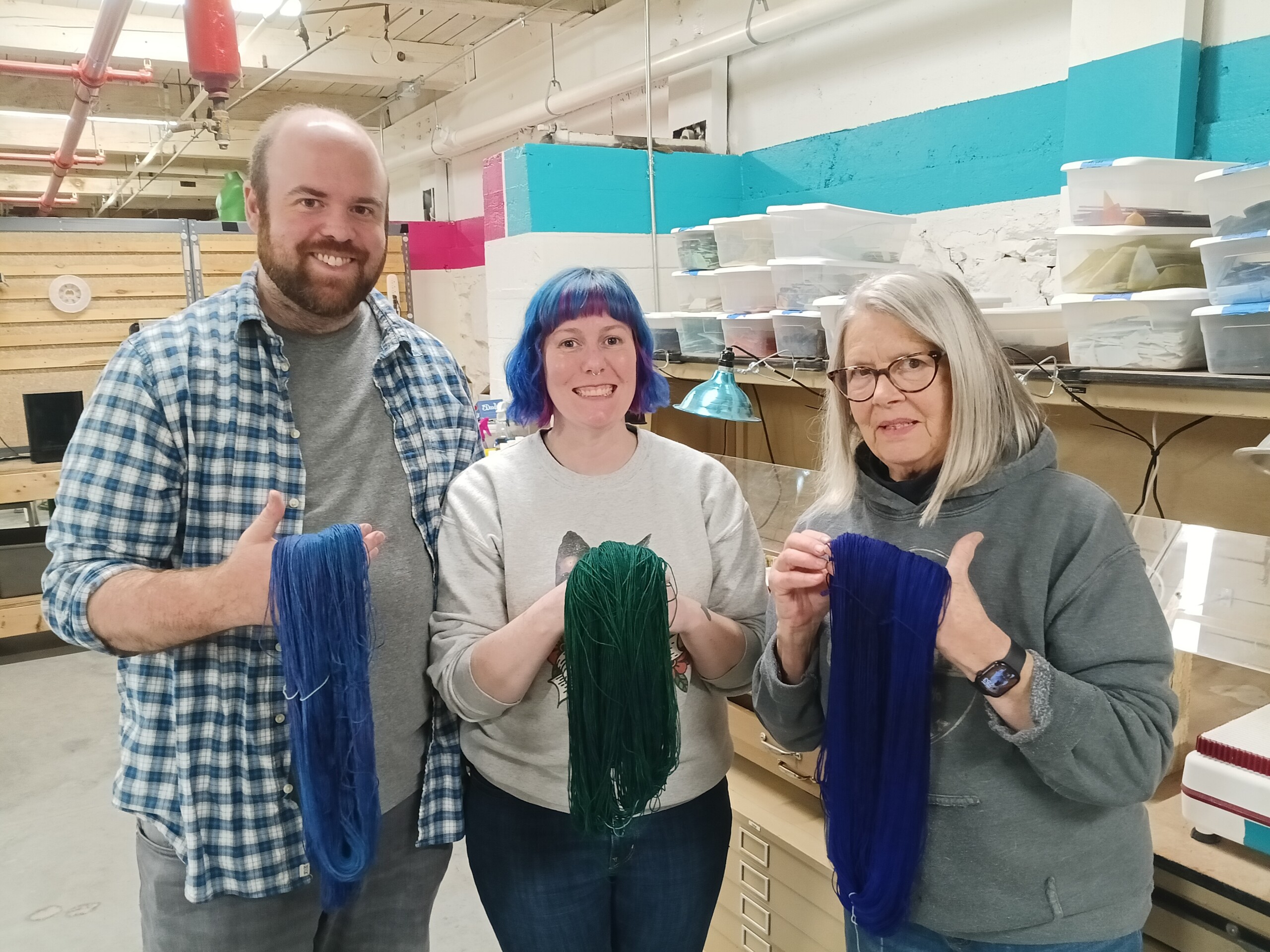 Students Dana Wood, Norm MacLennan and Kerry MacLennan show off their final results from a yarn dyeing crash course class at MAXT. Photo Courtesy/ MAXT Makerspace