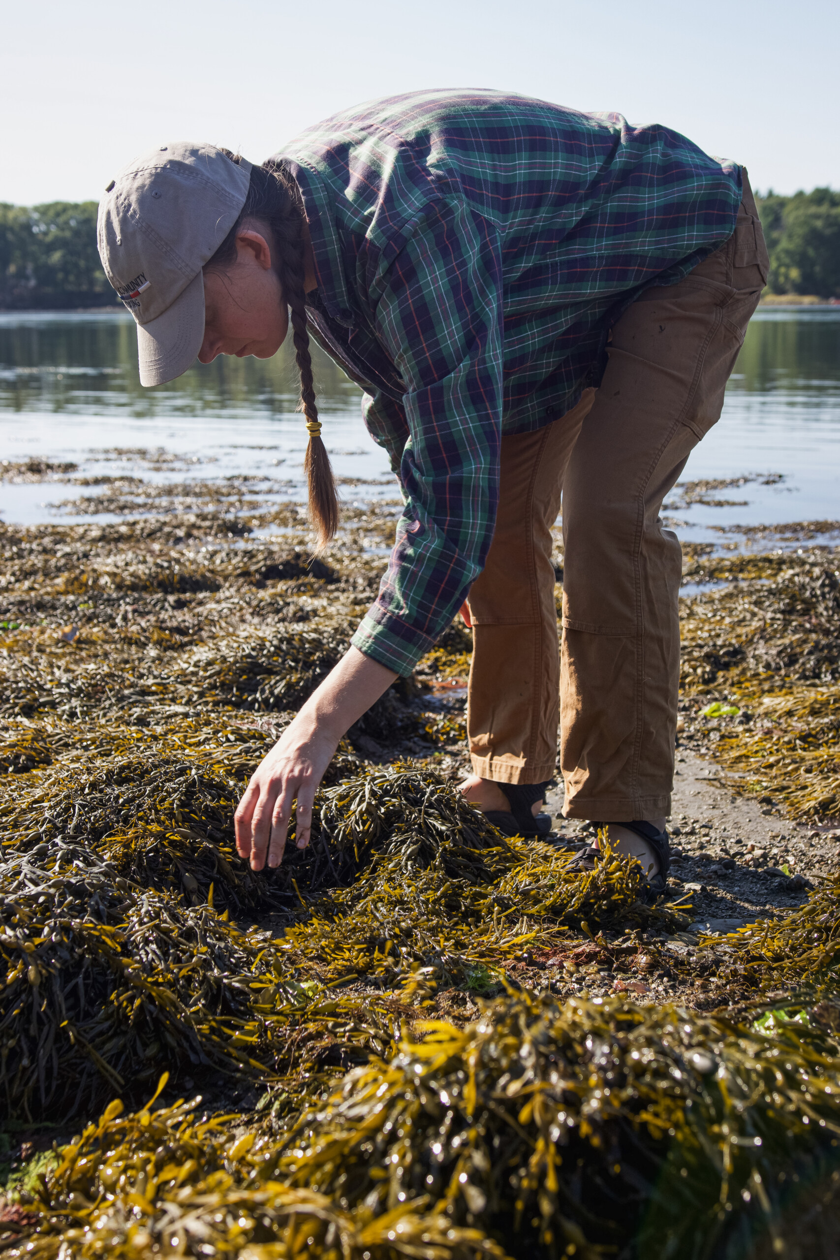 Katri Gurney of Concord, a UNH master’s student and a volunteer for the Great Green Crab Hunt, rummages through heavy piles of seaweed in search of green crabs, which hide under algae and rocks to molt.