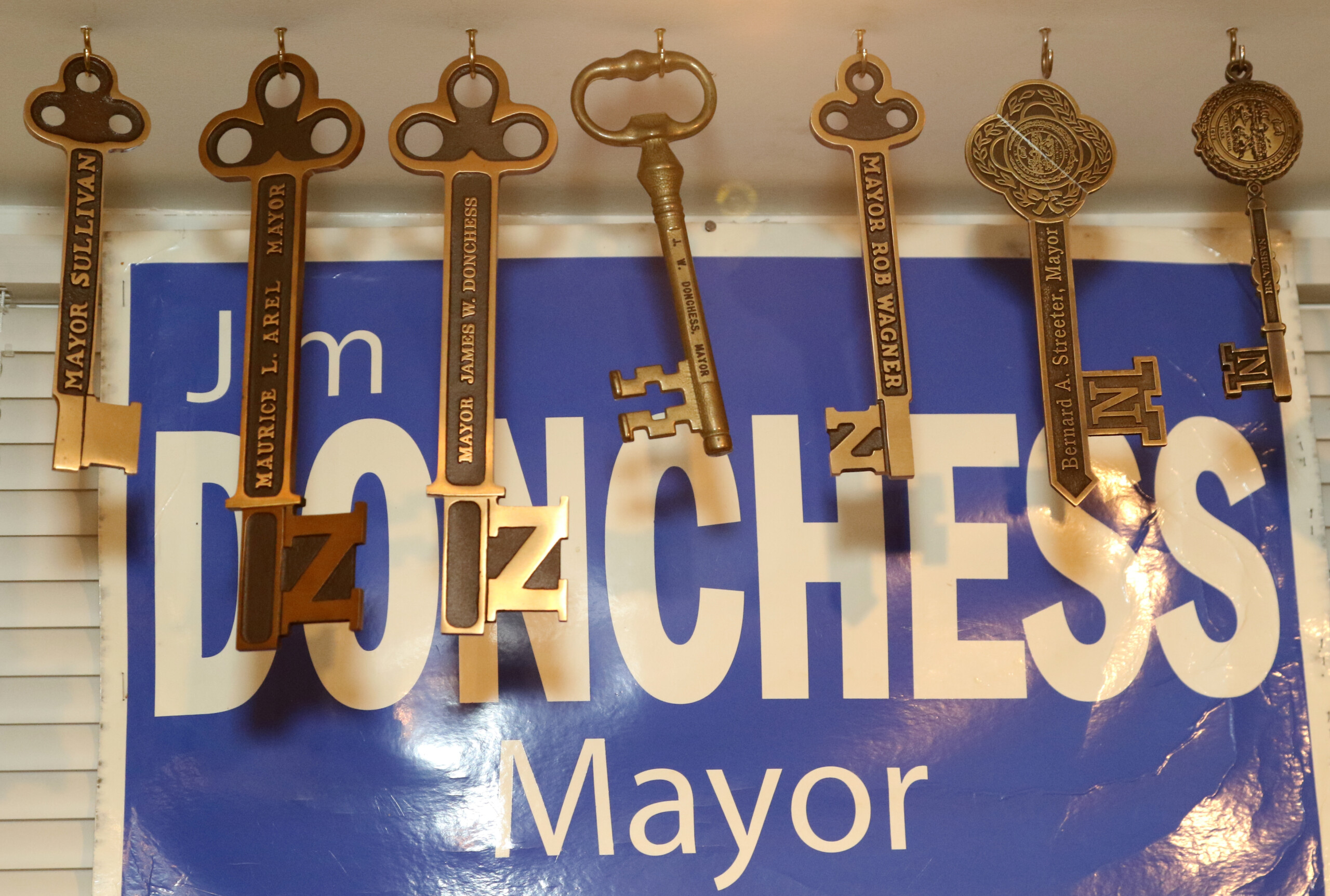 A 1993 graduate of Nashua High School, Craig Michaud’s meticulously curated exhibit on the “Gate City” is packed with items you’d expect to see at a historical society display: police badges, firefighter maps, military uniforms, school sports trophies, mayors’ “keys to the city,”  glass milk bottles from local dairies, streetcar tokens and minor league baseball memorabilia.