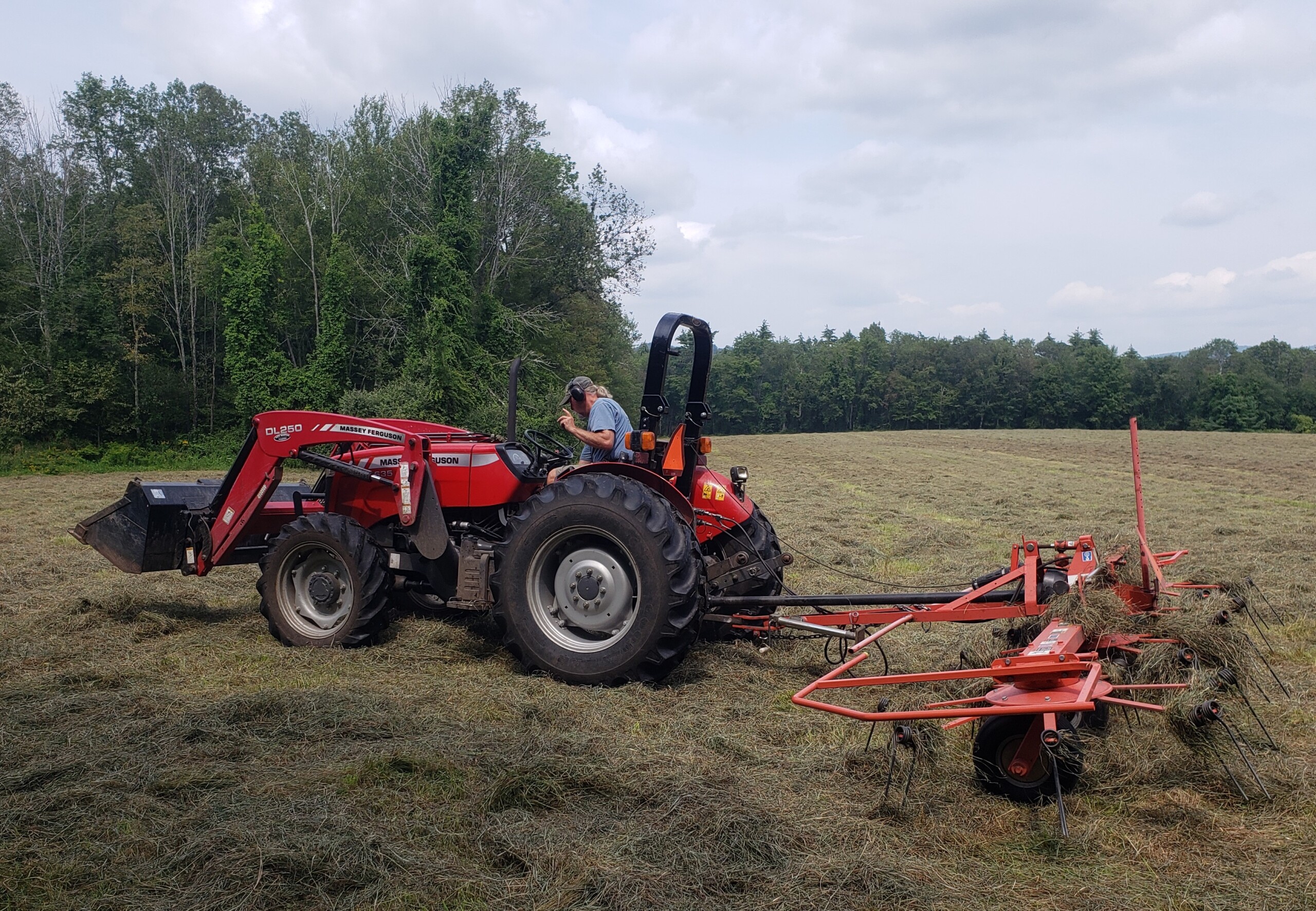 The old proverb says “Make hay while the sun shines,” and today the sun is shining, so I’m piloting a Massey Ferguson tractor towing a rake, around and around the field creating a hay windrow in an ever-tightening spiral. Yesterday I drove the same pattern on a John Deere tractor pulling a tedder. Tedding fluffs the hay and turns it over, speeding up the drying process.