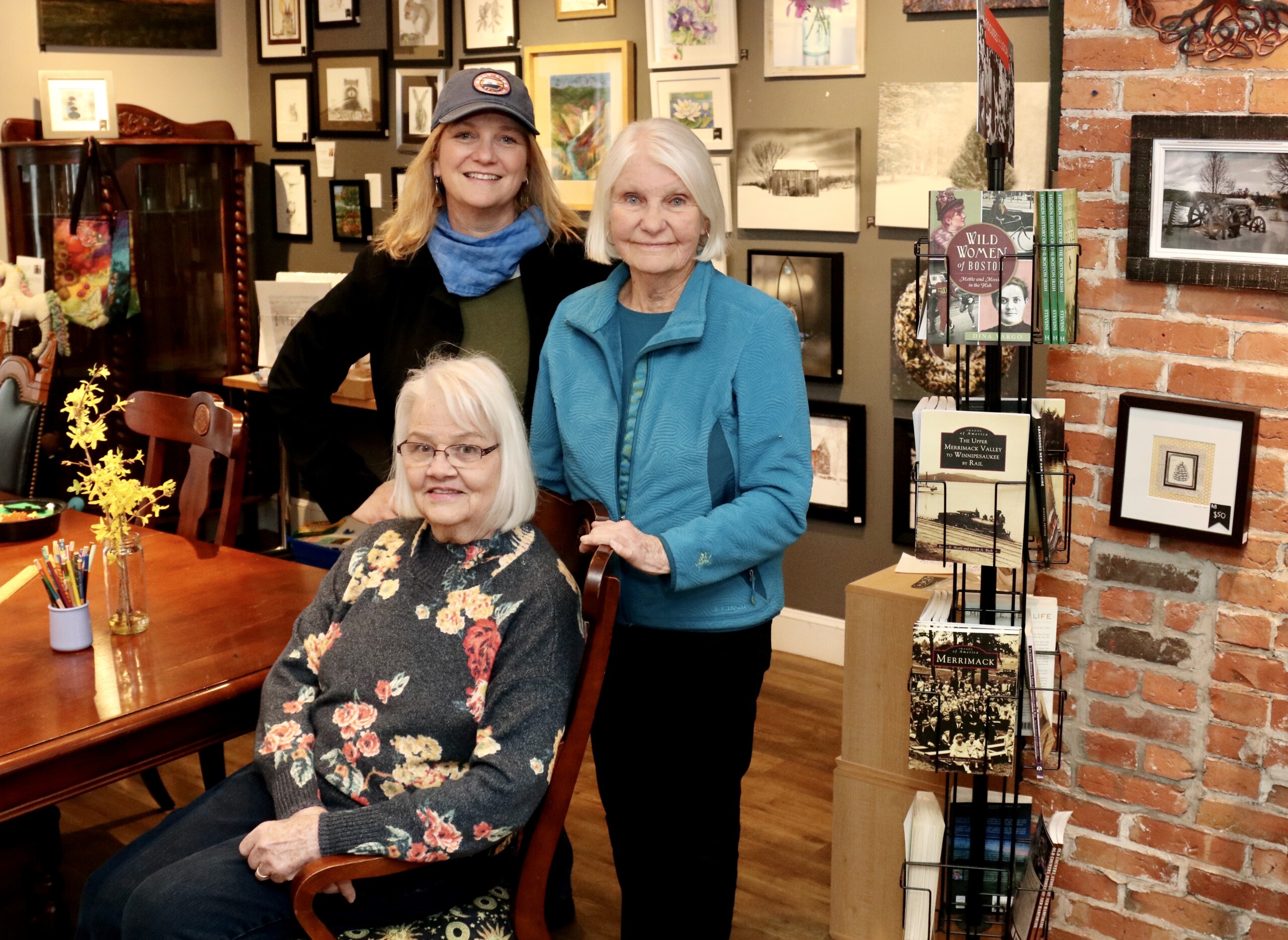 Anna Birch, left, her mother, Sue Birch, standing, and Sue’s sister, Sharon Howe, seated, stay busy with town activities. Anna Birch is co-owner of Hollis Artspace, Sue Birch is curator at the Hollis Historical Society and Howe is the historian for the Hollis Historical Society.