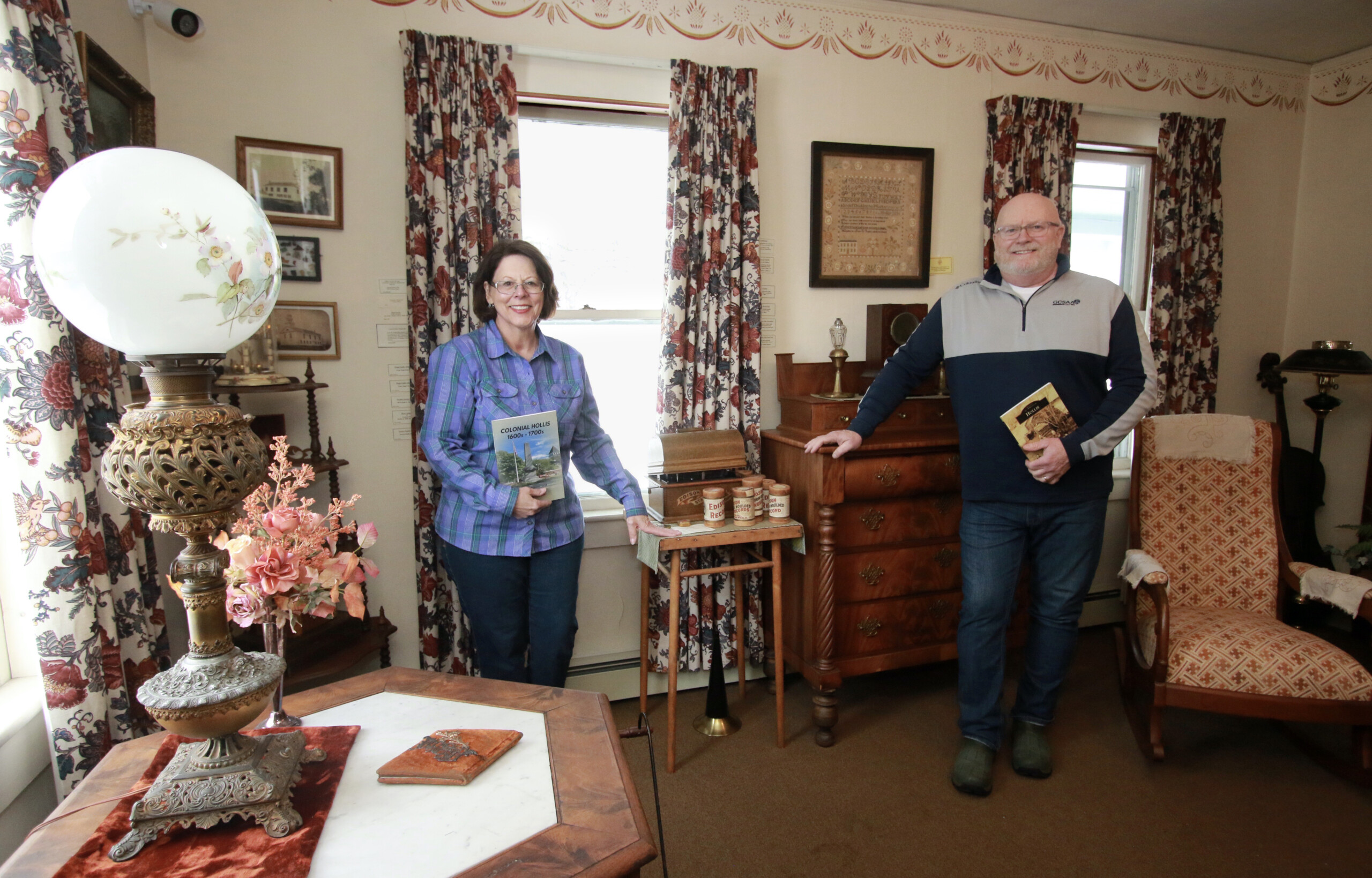 Louann Swaney, vice president of the Hollis Historical Society, and David Sullivan, director on the board of the Hollis Historical Association, visit the Ruth Hills Wheeler House on Main Street.