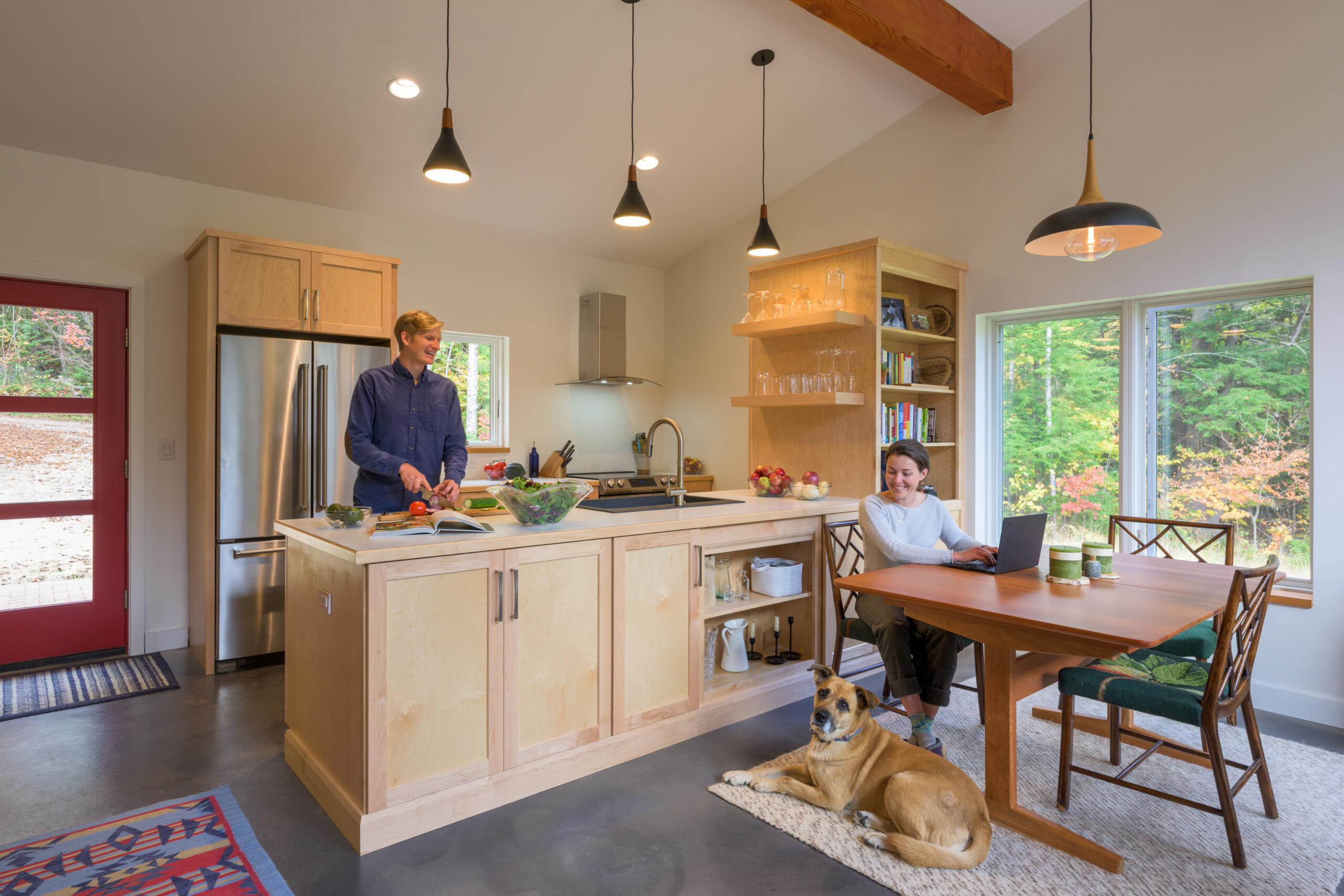 Pier and Emily love the openness of their new kitchen, and their dog, Nellie, likes being wherever the sunshine lands. One-half of the house is devoted to an efficient lineup of kitchen, dining and living spaces.