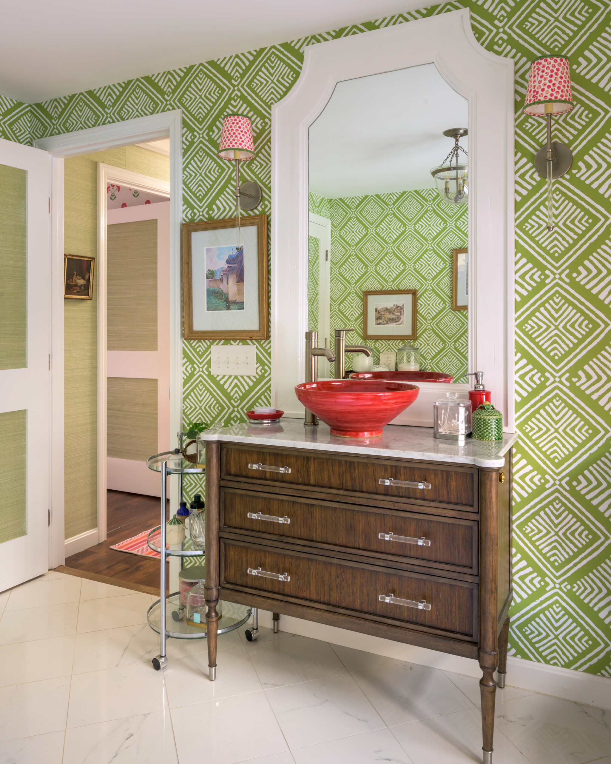 Designer Ann Henderson transformed a vintage bureau into a one-of-a-kind vanity by adding a red bowl sink and a modern faucet. Photo by John W. Hession