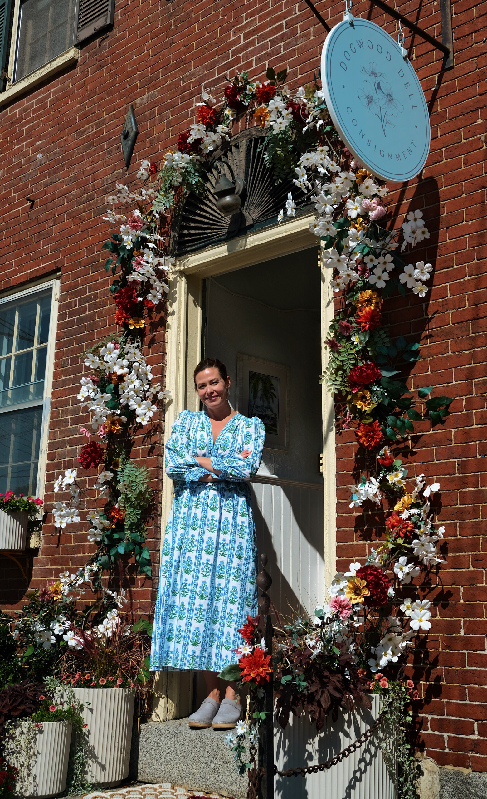 Owner Cammie Switzer stands in the doorway of Exeter’s Dogwood Dell, a consignment store