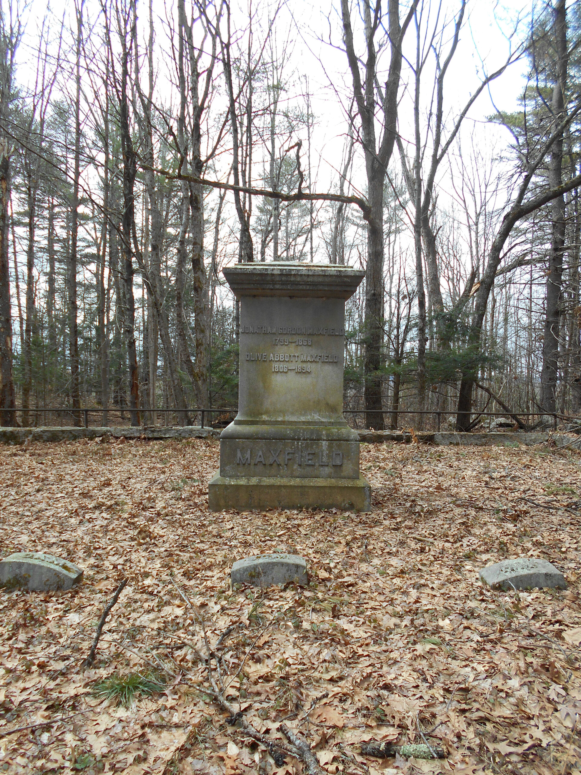 An important-looking monument in the center of the cemetery announces the name, “Maxfield.” Collectively, the dates on the headstones suggest the family resided here for generations, up until the early 1900s. Puzzled by why such a prominent monument would exist at this remote hardscrabble farm, I found the answer in an old newspaper clipping.