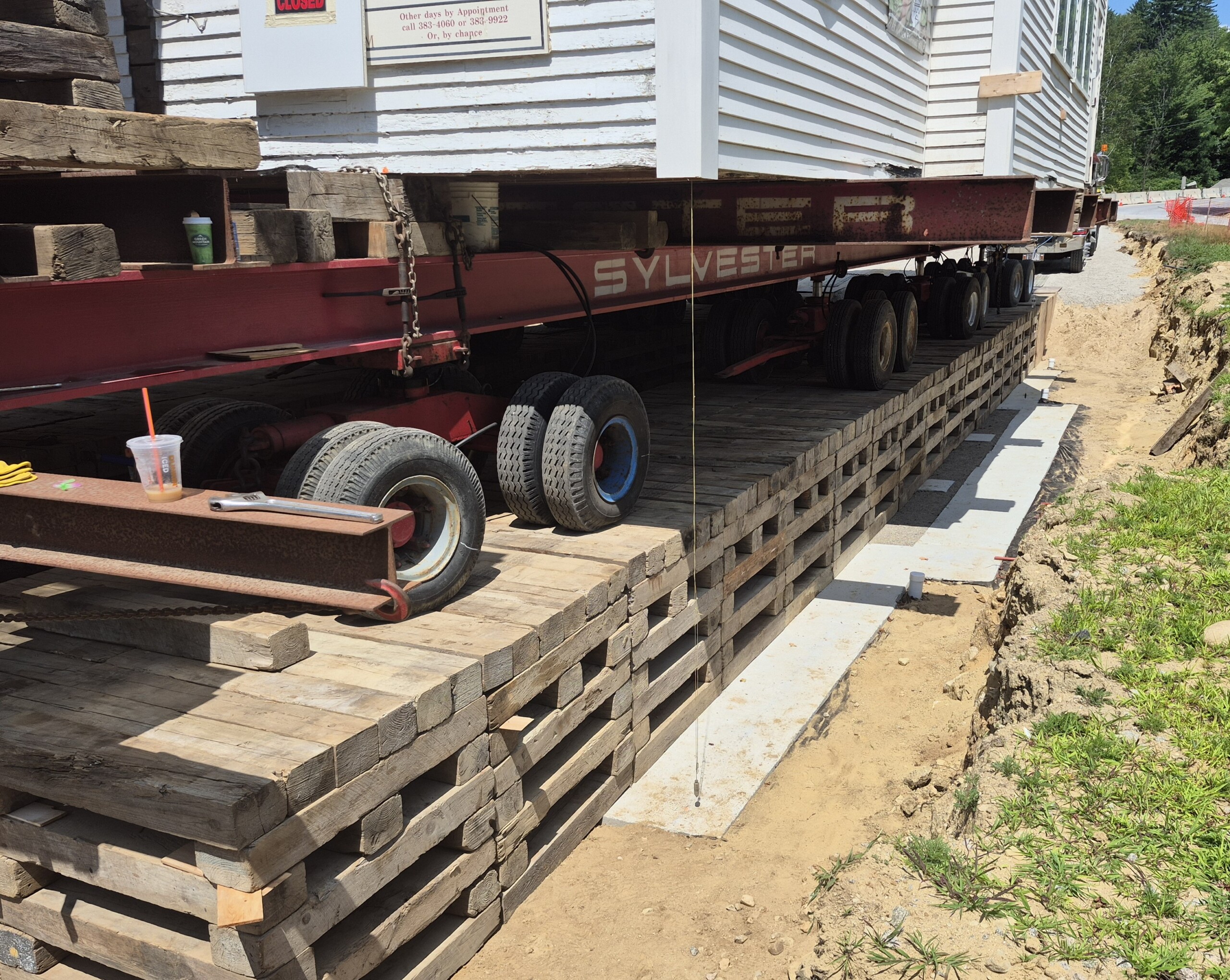 At the new site, the cellar hole had been excavated and a concrete footing poured. On the footing, an orange paint dot, the size of a quarter, marked the target for the building to end up at, if everything went as planned. About 200 feet away, up Black Mountain Road, the old building was ready to make the big jump. It had been jacked up in the air and seated on I-beams with dolly wheels and was ready to roll. An eight-man team from Sylvester Building Movers of Falmouth, Mass., was busy with last-minute preparations, taking aim to make the building hit the target.